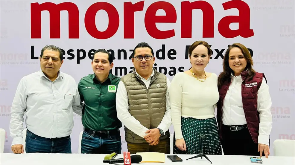 NUEVO LAREDO, Tamaulipas.- En conferencia de prensa, Mario Llergo, delegado político del Comité Ejecutivo Nacional (CEN) de MORENA; acompañado de Yuriria Vázquez, presidenta del Comité Directivo Estatal de MORENA, anunciaron que la alcaldesa de Nuevo Laredo, Carmen Lilia Canturosas Villarreal, ha superado en las encuestas al también aspirante a la candidatura por la alcaldía, Ramón Garza Barrios.