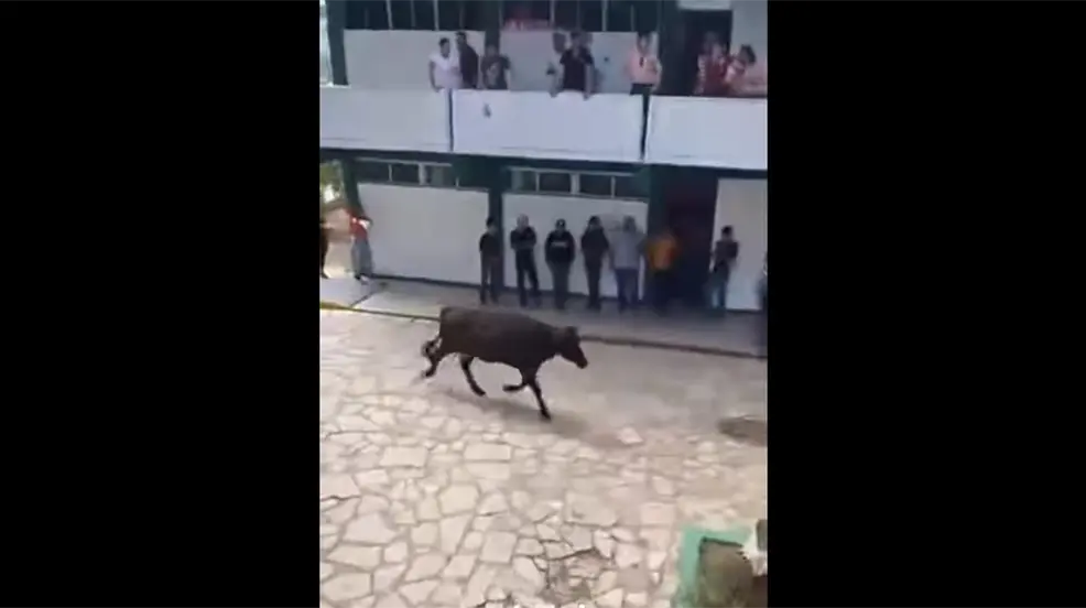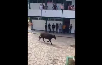 La vaquilla comenzó una loca carrera por los pasillos de la escuela mientras el estudiante trataba de impedirle que siguiera su loca carrera, alentado desde el segundo piso por sus compañeros de escuela.
