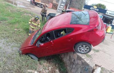 Este automóvil en color rojo, perdió el control de la unidad cayendo al canal de dicha avenida, el cual contaba con un poco de agua, derivado de las recientes, lluvias registradas .