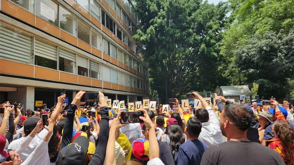 Mientras hay conteo en Venezuela, cientos de ciudadanos sudamericanos se embanqué acercado a las afueras de la embajada de su país a la espera del resultado de las elecciones, el cual podría darse a conocer esta misma noche o el día de mañana, lunes, esperando que Maduro no repita en el poder.