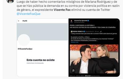 VICTORIA, Tamaulipas.- El expresidente de México, Vicente Fox, ha cerrado su cuenta en la plataforma 'X' luego de desencadenar una polémica con sus comentarios hacia Mariana Rodríguez, esposa de Samuel García, candidato a la Presidencia de México, en relación con una publicación de Pedro Ferriz.