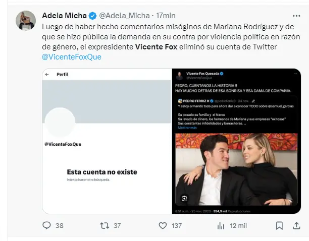 Vicente Fox cierra cuenta de 'X' tras polémica por comentarios hacia Mariana