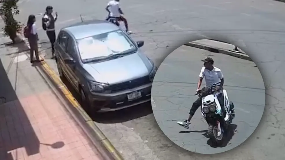 Una cámara de videovigilancia privada grabó el momento en que dos jóvenes, que portaban mochilas, caminaban por debajo de la banqueta alrededor de las 13:20 horas del pasado miércoles 12 de junio, en la Calzada La Naranja. Situación que un sujeto a bordo de una motoneta blanca aprovechó para quitarles sus pertenencias.