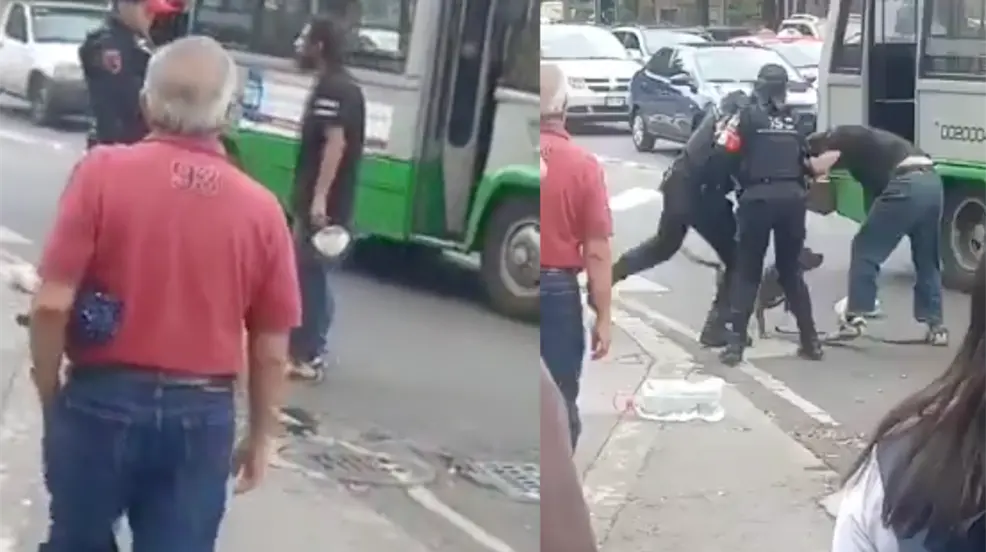 El video muestra al policía acercándose al hombre, seguido de una discusión en la que el sujeto agita los brazos y el oficial responde empujándolo y golpeándolo. Mientras tanto, personas presentes en el lugar tomaron al perro y posteriormente se lo devolvieron al dueño.