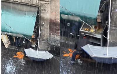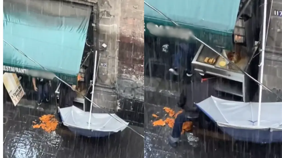 En el video se observa a dos empleados de la taquería levantando rápidamente la carne de un trompo al pastor que, aparentemente, se había caído al suelo. Las imágenes muestran cómo, a pesar de la intensa lluvia que dificulta su labor, los trabajadores intentan recuperar la carne lo más rápido posible.