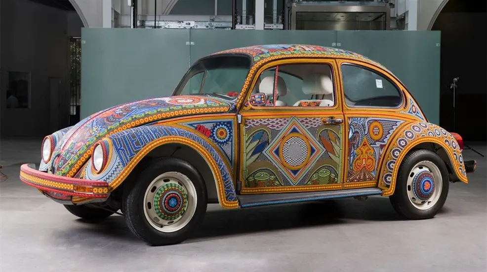 El Vochol es un Volkswagen Sedán, comúnmente conocido como “Vocho”, decorado con más de 2 millones de cuentas de chaquira aplicadas a mano por artesanos huicholes. Cada centímetro del automóvil está cubierto con intrincados diseños que representan la cosmogonía y las tradiciones del pueblo wixárika (huichol), utilizando colores vivos y patrones detallados que cuentan historias ancestrales.