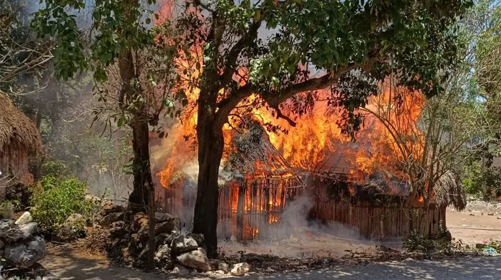 Las llamas consumieron las estructuras de dos viviendas luego de que cayera el cohete sobre los techos de huano