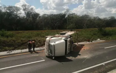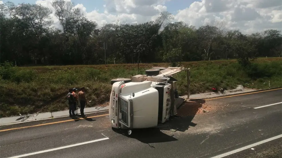 KANTUNIL, Yucatán.- Un tráiler que trasladaba material del Tren Maya volcó en el kilómetro 72 de la carretera Valladolid-Mérida, en el tramo que va de Xocchel a Kantunil, pese a lo aparatoso del incidente, el chofer resultó ileso.