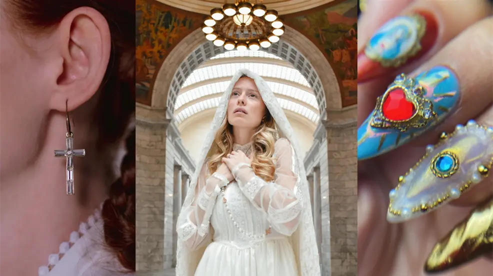 Las prendas características del "Catholic Core" evocan la solemnidad de las ceremonias religiosas, con faldas y vestidos largos que remiten a los trajes utilizados en bautizos, primeras comuniones y bodas. Los accesorios desempeñan un papel fundamental en la creación de este estilo, con coronas de flores, tocados con perlas, guantes y velos bordados que completan el look distintivo.