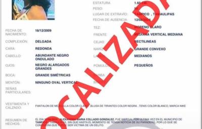 VICTORIA, Tamaulipas.- Después de reportarse su desaparición a través de un boletín de búsqueda, la tarde de este martes, se dio a conocer que ya fue localizada Alejandra María Collado González, hija de la diputada federal del Partido Acción Nacional y ex candidata a la alcaldía de Tampico Rosa María González Azcárraga.