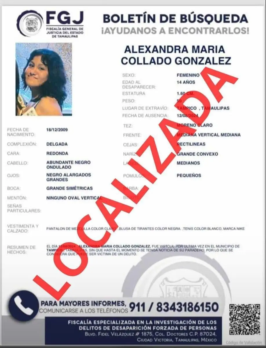 Después de reportarse su desaparición a través de un boletín de búsqueda, la tarde de este martes, se dio a conocer que ya fue localizada Alejandra María Collado González