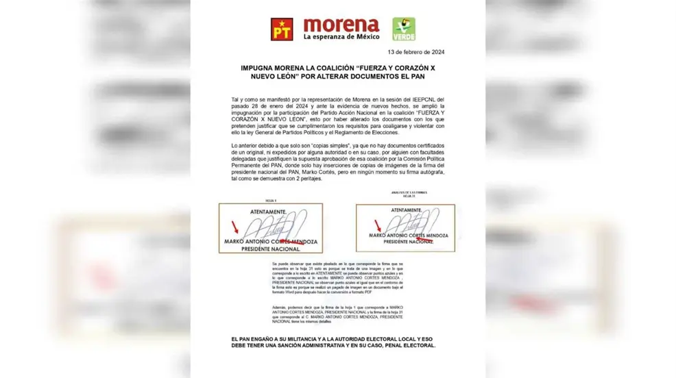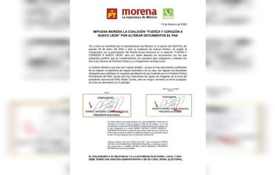 A través de un escrito, los morenistas resaltan que esta información se dio a conocer el 28 de enero del 2024 en la sesión del Instituto Estatal Electoral y de Participación Ciudadana de Nuevo León, donde se mostraron pruebas de la documentación ilegal que presentó el Partido Acción Nacional para sumarse al PRI y PRD en coalición.