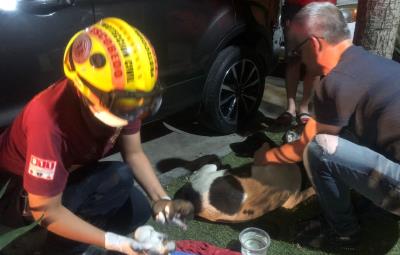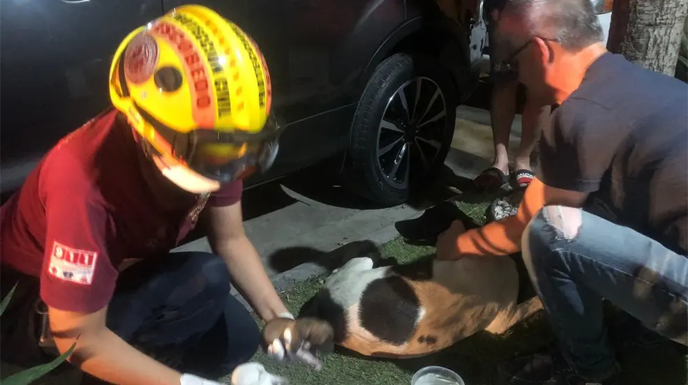 La rápida acción de los brigadistas evitó que la mascota muriera en plena vía pública, donde se había solicitado ayuda a través de un reporte ciudadano.