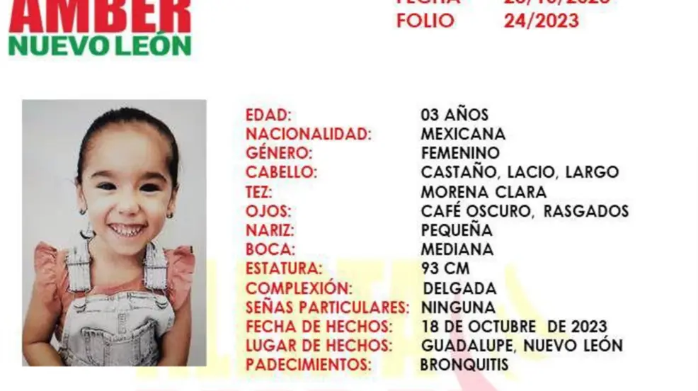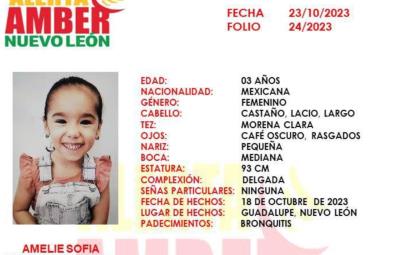 GUADALUPE, Nuevo León.- La Fiscalía General de Justicia de Nuevo León activó la Alerta Amber para localizar a la niña Amelie Sofía Iglesias Pámanes, de 3 años, quien desapareció el pasado 18 de octubre de 2023 en el municipio de Guadalupe.