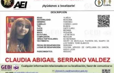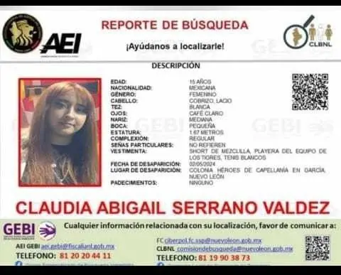 GARCÍA, Nuevo León.- La joven Claudia Abigaíl Serrano Valdez de 15 años, estudiante de la Preparatoria de la Universidad Autónoma de Nuevo León (UANL) fue reportada desaparecida por sus familiares desde el pasado 2 de mayo en el municipio de García.