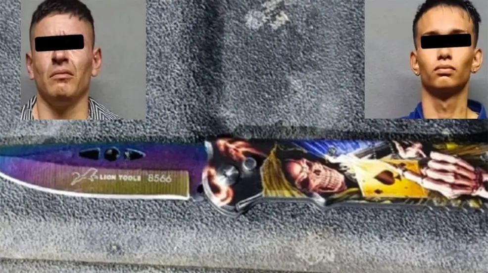Dos presuntos asaltantes que utilizaban un cuchillo con la imagen de la Santa Muerte para robar tiendas de conveniencia fueron detenidos en Apodaca.
