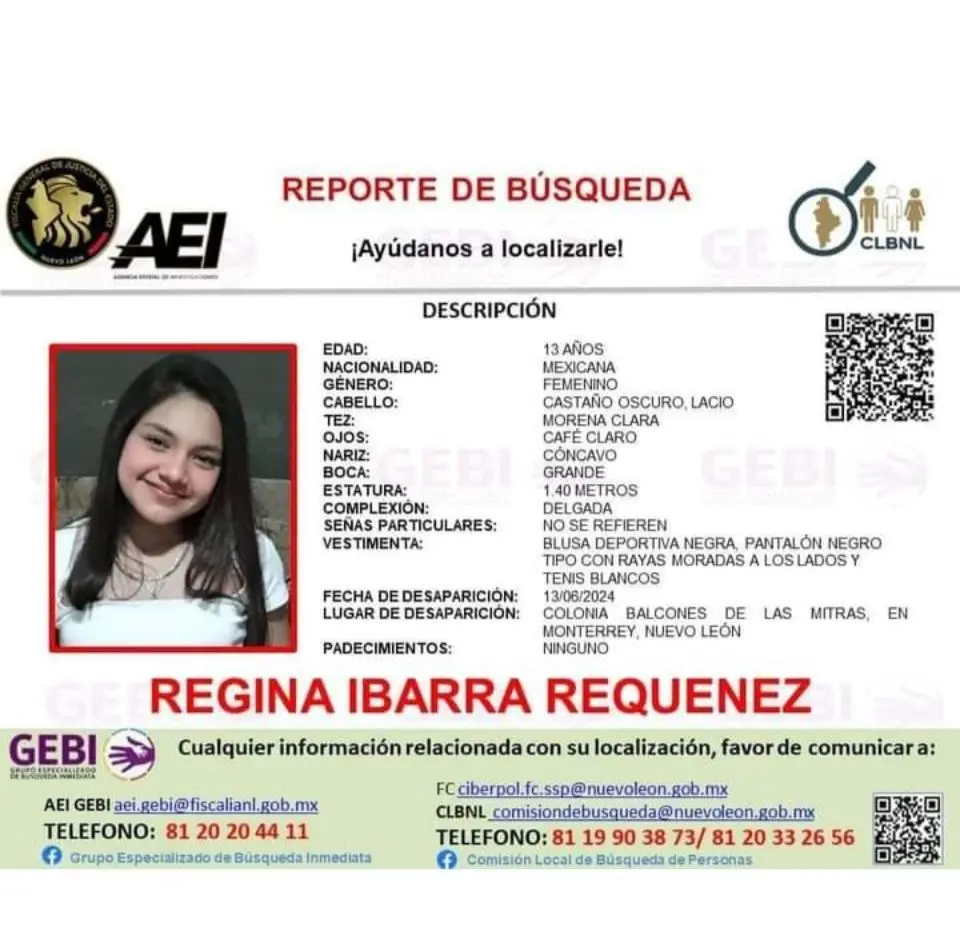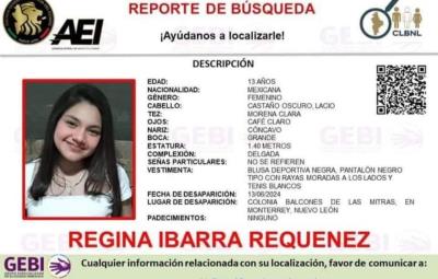 Autoridades estatales emitieron un reporte de búsqueda de la menor de 13 años, Regina Ibarra Requenez, desaparecida en la colonia Balcones de las Mitras, en Monterrey.