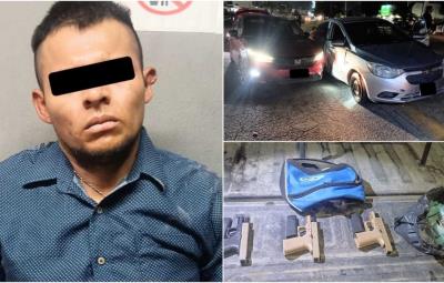 Policías de la Guardia de Proximidad de Apodaca detuvieron a un hombre que portaba en la cintura una pistola y además dentro del auto en que viajaba llevaba una mochila con otras dos armas de fuego.