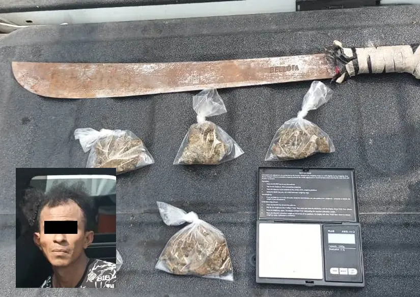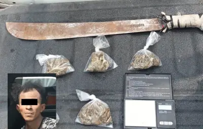 Al revisaron le encontraron el machete, cinco bolsas transparentes, conteniendo en el interior hierba verde y seca con las características de la mariguana y una báscula digital.