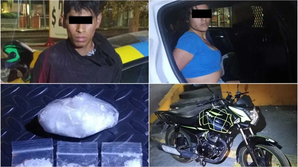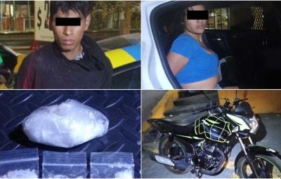 MONTERREY, Nuevo León.-Un joven de 24 años y una menor de 17 años fueron detenidos por oficiales de la Policía de Monterrey, luego de ser encontrados a bordo de una motocicleta con placa colgada y portando cuatro bolsas con una sustancia sólida similar a la droga conocida como cristal, en la colonia Mitras Sur.
