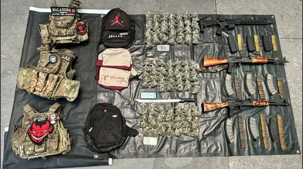 En total, se aseguraron ocho armas de fuego, 39 cargadores, 957 cartuchos, 198 gr de metanfetamina, 390 gr de marihuana, ocho chalecos tácticos y un vehículo.