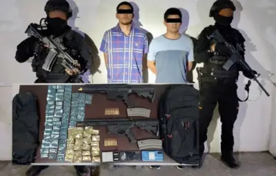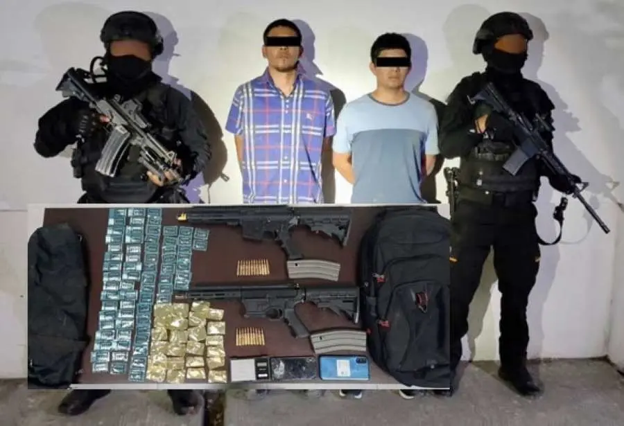 Los detenidos fueron identificados como Marcos “N” y Bonifacio “N”, ambos de 27 años de edad, quienes portaban dos armas largas con cargadores y cartuchos hábiles al momento de su captura en la colonia San Miguel Residencial, en Escobedo.
