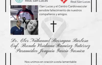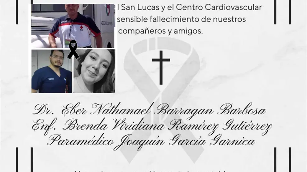 “El Hospital Real San Lucas lamenta el sensible fallecimiento de nuestros compañeros y amigos: Dr. Eber Nathanael Barragán Barbosa; Enf. Brenda Viridiana Ramírez Gutiérrez; Paramédico Joaquín García Garnica. Nos unimos en oración a esta lamentable pérdida”, menciona el escrito.
