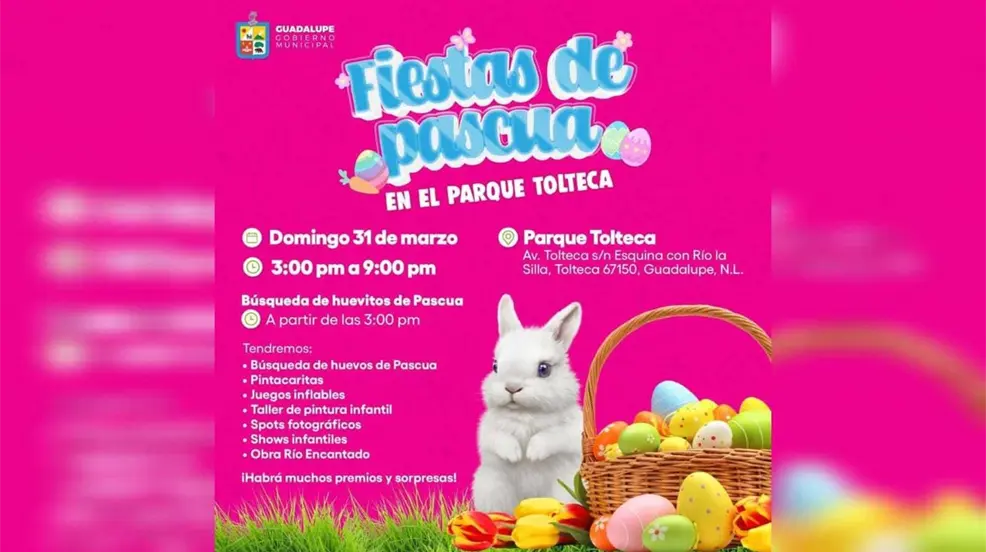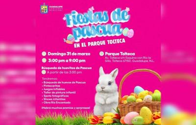 No te pierdas el gran cierre de semana el domingo 31 de marzo con la tómbola de huevos premiados, la presencia de la coneja de Pascua, la obra de teatro y sets fotográficos para toda la familia. Recuerda atender las medidas de prevención de Protección Civil y contar con la atención del personal de Servicios de Emergencia de la Clínica Médica Municipal en caso de cualquier situación.