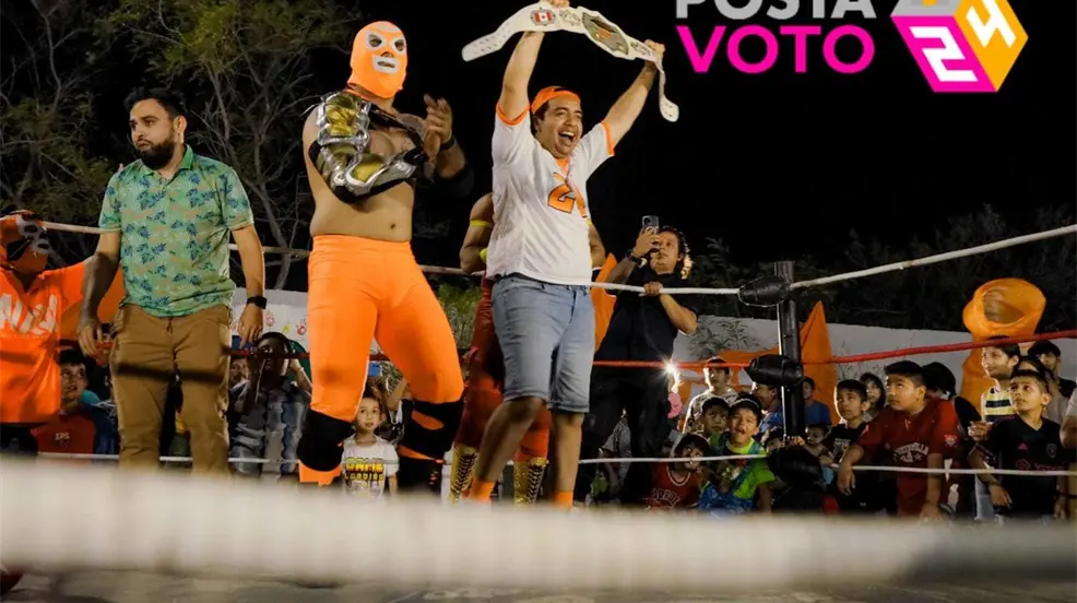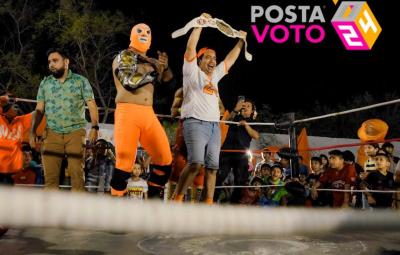 El candidato emecista sorprendió a todos al subir al ring y aplicar un dropkick a su enmascarado rival azul, logrando la victoria en un combate lleno de adrenalina. El evento, que se llevó a cabo en la colonia San Gilberto, fue parte de las celebraciones por el Día del Niño y contó con la presencia de familias enteras que disfrutaron de la acción y emoción de la lucha libre.