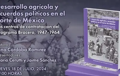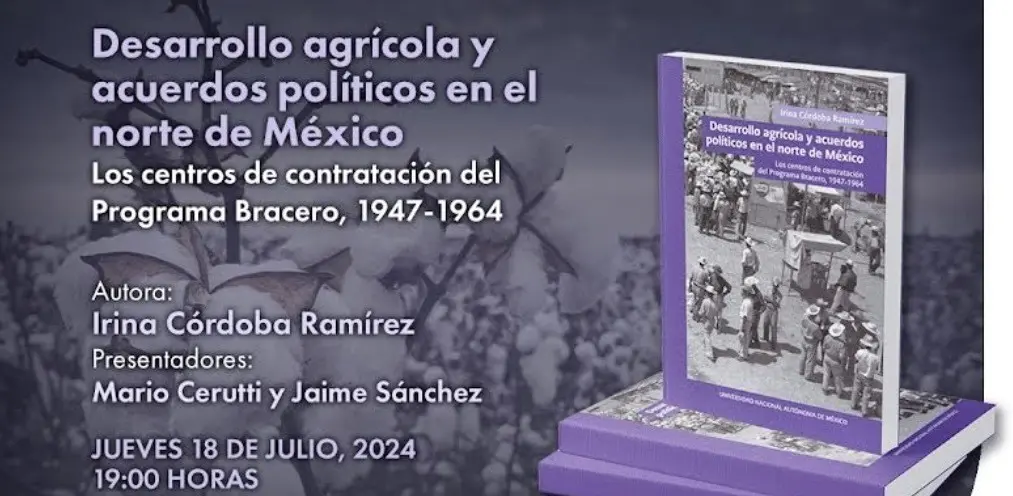 MONTERREY, Nuevo León.- El libro Desarrollo agrícola y acuerdos políticos en el norte de México. Los centros de contratación del programa bracero, 1947-1964 de la autora Irina Córdoba Ramírez será presentado el jueves 18 de julio a las 19:00 horas en el Museo de Historia Mexicana. En esta obra, la autora analiza los escenarios de negociación que surgieron a raíz de los procesos migratorios y la importancia del algodón en el desarrollo agrícola en México.
