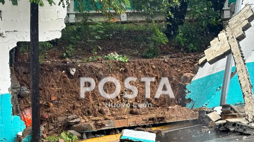 MONTERREY, Nuevo León.- La barda de un plantel educativo en el sur de Monterrey se vino abajo con las fuertes lluvias que se han estado registrando en el estado de Nuevo León a causa de la depresión tropical 'Alberto'.