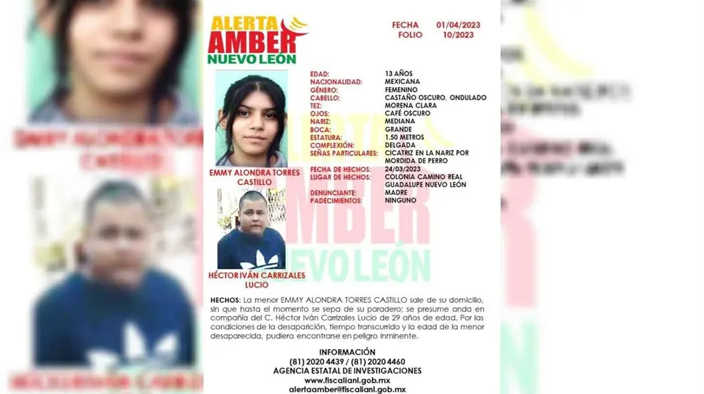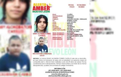 MONTERREY, Nuevo León.- La Agencia Estatal de Investigaciones actualizó la ficha de búsqueda de la menor Emmy Alondra Torres Castillo, de 13 años de edad, quien desapareció el pasado 24 de marzo del 2023.