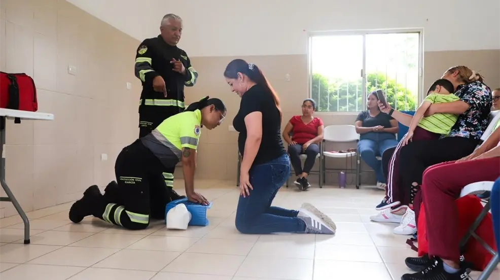 GARCÍA, Nuevo León.- En el municipio de García, los vecinos de las colonias Santa María, Héroes de Capellanía y Novelia Residencial se capacitaron en primeros auxilios gracias al curso impartido por el personal de Protección Civil.