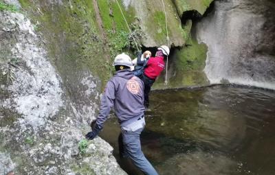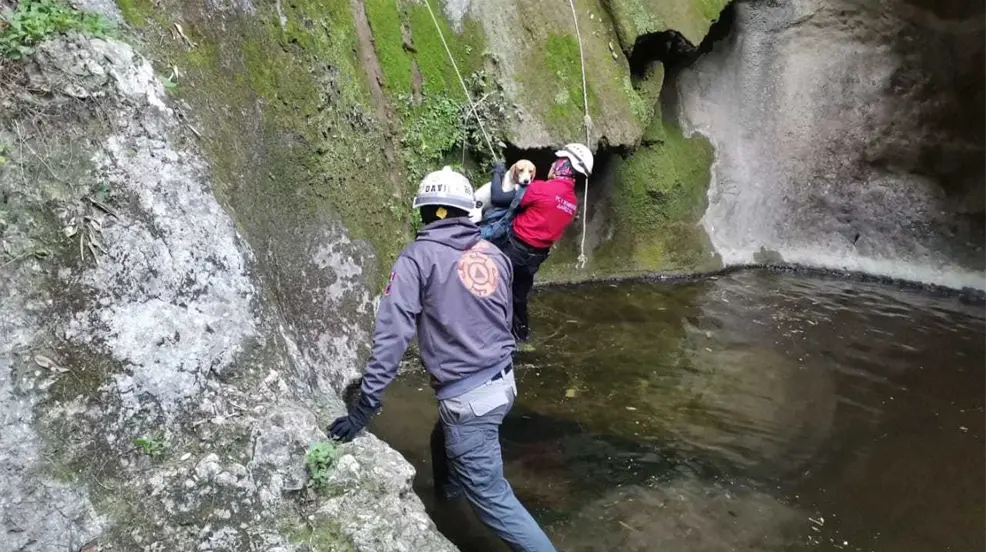 El equipo de rescate de Protección Civil se dirigió rápidamente al lugar y, utilizando equipo de cuerdas, lograron bajar al perrito y ponerlo a salvo.