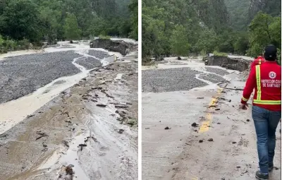 SANTIAGO, Nuevo León.- Las lluvias de la tormenta tropical Alberto afectaron el camino a Laguna de Sánchez, interrumpiendo el acceso a la zona.