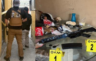 El primero de estos operativos se llevó a cabo en la calle Privada Niño Artillero 1201 B, donde se logró el aseguramiento de un cargador abastecido con 11 municiones, un arma larga, una báscula, cuatro piezas de aluminio con restos sólidos color blanco, una bolsa transparente en su interior hierba verde y seca, un DVR en color negro y una mochila en color gris en su interior 9 bolsas transparentes con hierba verde y seca.