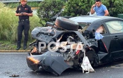 Presuntamente el exceso de velocidad y lo resbaladizo de la carpeta asfáltica provocaron que el carro color negro derrapara y terminara sin las dos llantas traseras en medio del carril de alta velocidad.