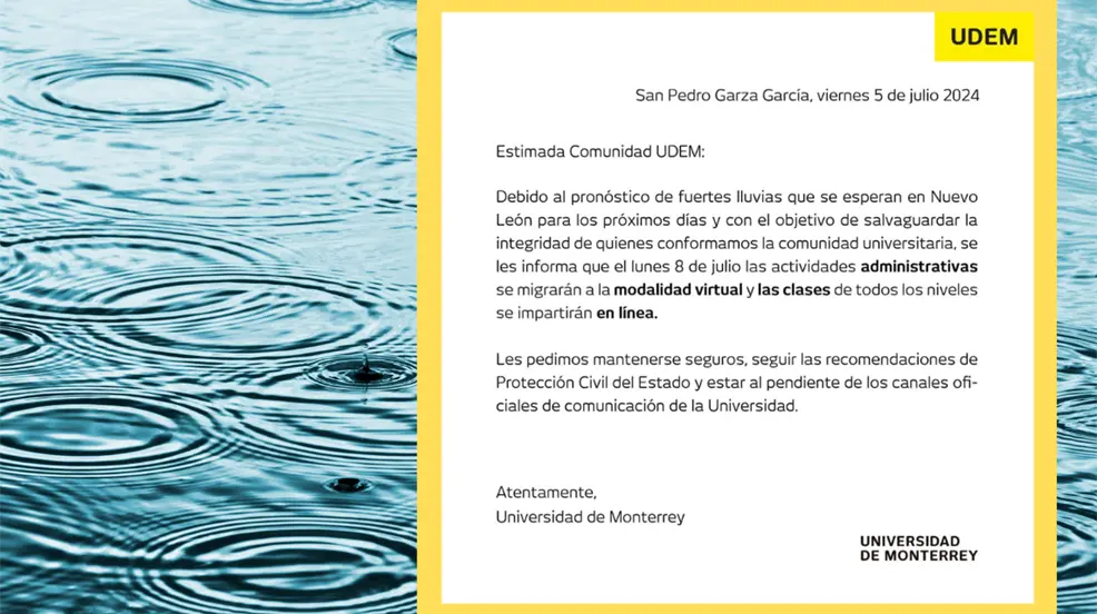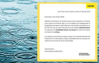 UDEM anuncia "clases en línea" por lluvias en Nuevo León