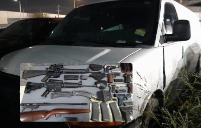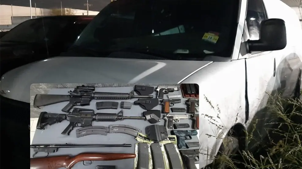 Durante la revisión del vehículo, las autoridades encontraron siete armas cortas, tres armas largas, 17 cargadores y mil 168 cartuchos de diversos calibres, además de otros objetos relacionados.