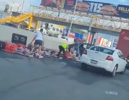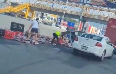 Volcadura de tráiler provoca rapiña de refrescos en Monterrey