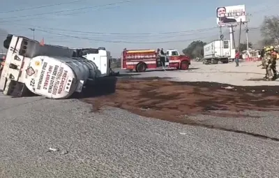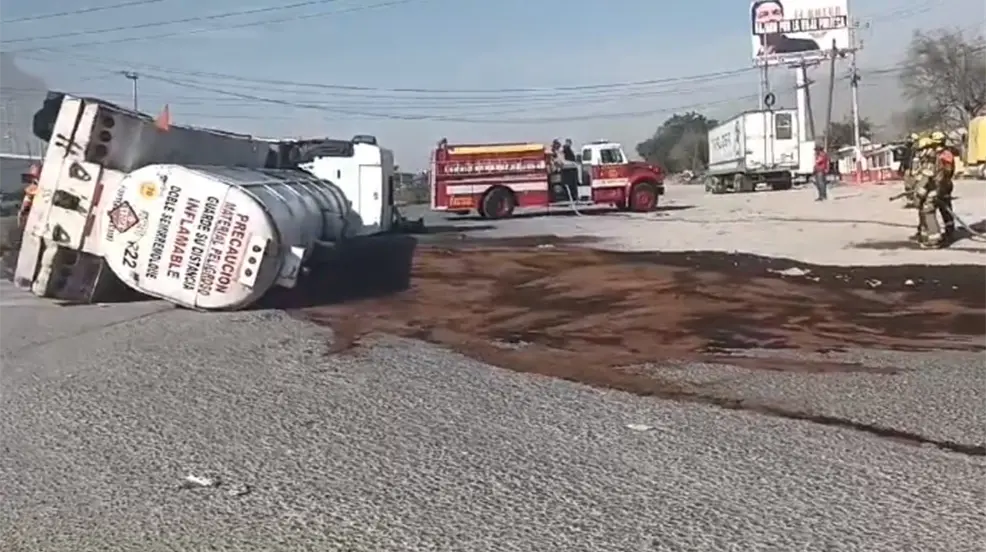 Una pipa con material inflamable volcó sobre la carretera a Saltillo y entronque a carretera García, en Santa Catarina; no hay reporte de lesionados.