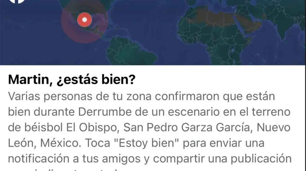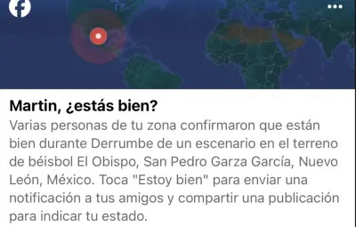 En la alerta de la aplicación de Facebook, se indicó a los usuario que presionaran la opción 'Estoy bien', para que así pudiera enviarse una notificación a los amigos de los usuarios. También se desplegó la opción de compartir una publicación para indicar el estado del consumidor. Además, la alerta incluyó una leyenda que decía que varias personas de la zona del usuario, confirmaron que están bien durante Derrumbe de un escenario de béisbol en San Pedro Garza García en Nuevo León.