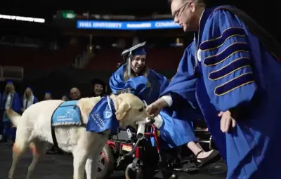 NUEVA JERSEY, Estados Unidos.- En una ceremonia de graduación, un perro guía recibió junto a su joven dueña un diploma por parte de la Universidad de South Orange, Nueva Jersey, luego de que ambos asistieran portando toga y birrete a recibir su reconocimiento por haber concluido sus estudios.