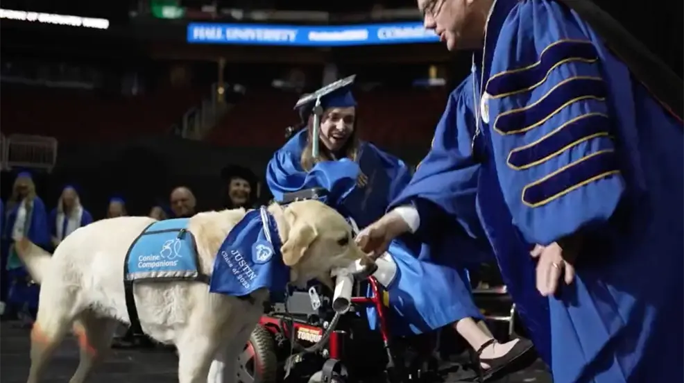 Un perro labrador recibió un diploma universitario junto a su dueña, por haber asistido con ella a todas las clases.