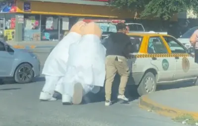 El video muestra cómo las botargas del Dr. Simi abandonaron su lugar de trabajo para apoyar al taxista, empujando el auto averiado y despejando la transitada vía.