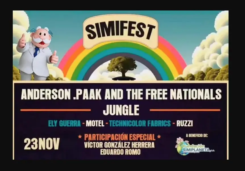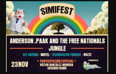 El SimiFest se llevará a cabo el próximo 23 de noviembre en el Parque Bicentenario de la Ciudad de México, a partir de las 12 horas. Con un aforo limitado a 17 mil personas, el evento contará con actuaciones de destacados artistas como Anderson .Paak and The Free Nationals, Jungle, Motel, Technicolor Fabrics, Ely Guerra, Ruzzi y Eduardo Romo. Los asistentes no solo disfrutarán de una variada oferta musical, sino que también tendrán la oportunidad de participar en actividades interactivas, como la fabricación de "bombas de vida" y la personalización de su propio simipeluche del Dr. Simi.