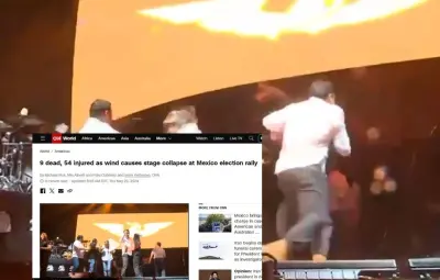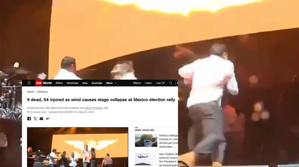 La tragedia que dejó al menos nueve muertos acaparó los titulares del medio BBC, donde retomaron parte del video en como los candidatos Jorge Álvarez Máynez y Lorenia Canavati corriendo del escenario, mientras las torres y pantalla principal en el escenario se desplomaban.