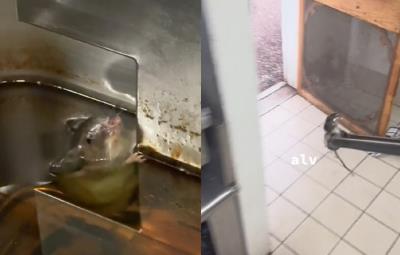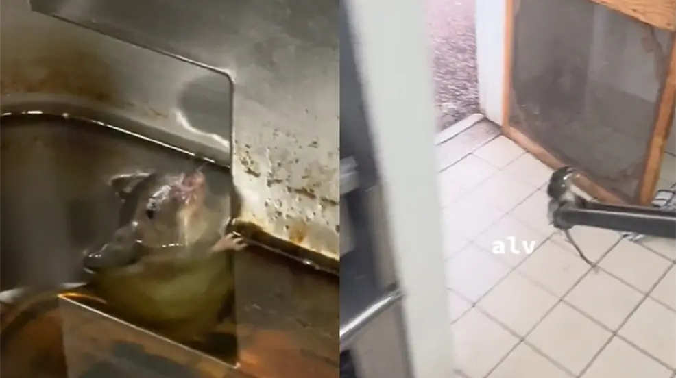Cae rata a freidora de restaurante; la saca viva con una pinza