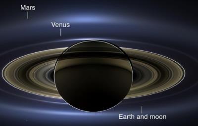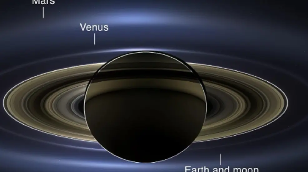 Nuestra nave espacial Cassini capturó esta imagen desde aproximadamente 746.000 millas (1,2 millones de kilómetros) utilizando filtros rojos, verdes y azules para crear esta vista de Saturno en colores naturales. Cassini no solo capturó al gigante gaseoso sino también algunos fotobombarderos mundiales con Venus, Marte, la Tierra y la Luna de la Tierra visibles como pequeños puntos de luz.