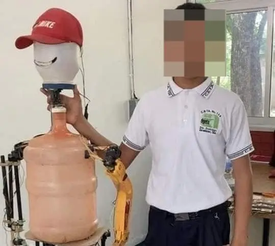 El joven ha sorprendido a todos al crear un robot utilizando materiales reciclados, se trata de Daniel Grapain Moreno, estudiante del CBTA 158 de Zanatepec, Oaxaca, quien ha dado vida a Larry, un robot confeccionado con un garrafón de agua y un envase de mayonesa.